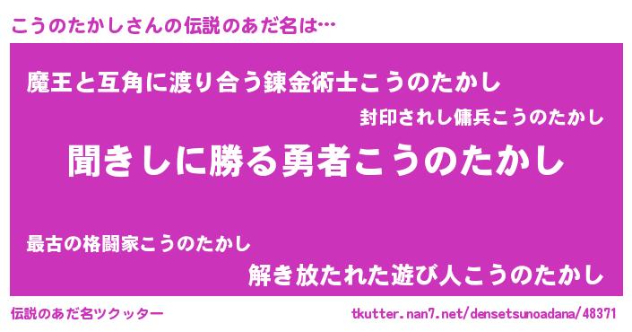 | 男性向けラノベタイトル風あだ名 | 『コウノタカシスレイヤー』 |