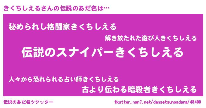 | 意味不明あだ名 | 『住所不定無職きくちしえる(85歳)』 |