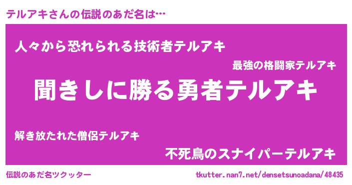 | ヒーロー風カッコイイあだ名 | 『仮面テルダー』『ネオテルアキ』 |
