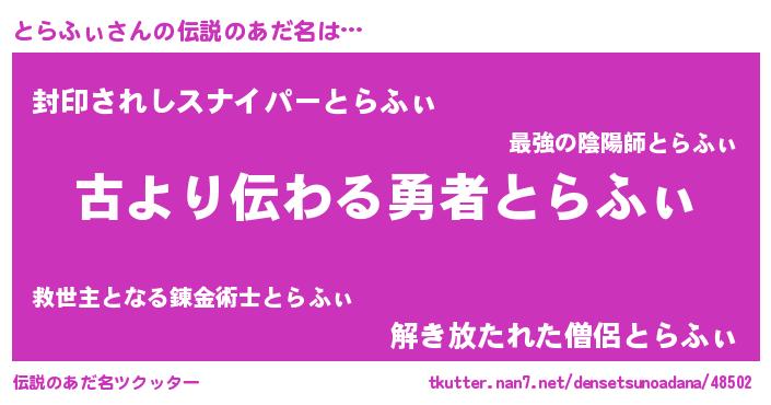 | ヘコむあだ名 | 『とらふぃ(遠い目)』『とらふぇ~』 |