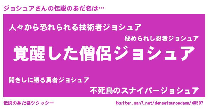 | ヒーロー風カッコイイあだ名 | 『天弓騎士ジョ』『究極戦士ジョシュア』 |