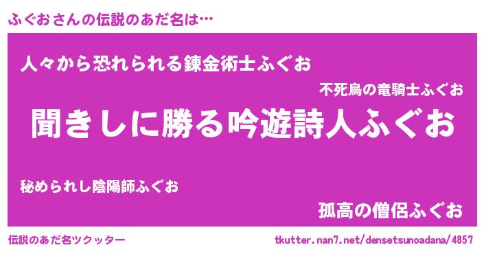 | 女子向けラノベタイトル風あだ名 | 『異世界で失敗しない100のふぐお』 |