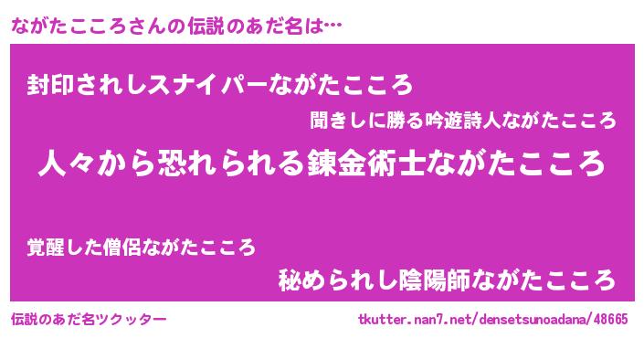 | 男性向けラノベタイトル風あだ名 | 『おまえをオタクにしてやるから、俺をながたこころにしてくれ! 』 |