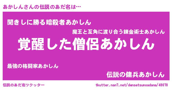 | 男性向けラノベタイトル風あだ名 | 『あかしんの嫁は女の子じゃないと思った?』 |