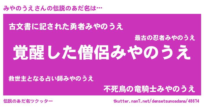 | ヒーロー風カッコイイあだ名 | 『仮面ミヤダー』『天弓騎士ミヤ』 |
