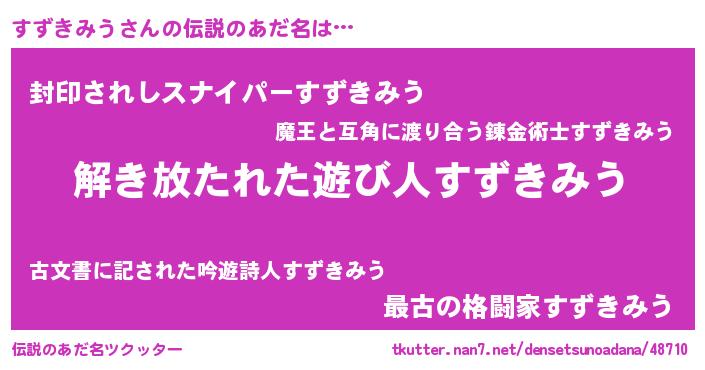 | ヒーロー風カッコイイあだ名 | 『幻影騎士スズ』『仮面スズダー』 |