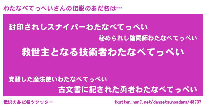 | 男性向けラノベタイトル風あだ名 | 『ノーゲーム・ノーワタナベテッペイ』 |
