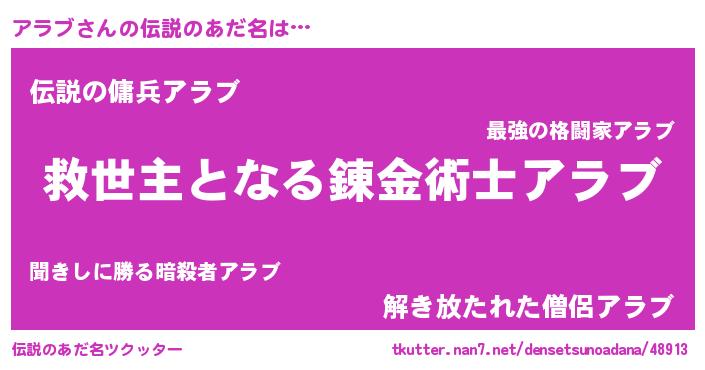 | 男性向けラノベタイトル風あだ名 | 『この素晴らしい世界にアラブを!』 |