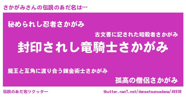 | ヒーロー風カッコイイあだ名 | 『究極戦士サカガミ』『仮面サカダー』 |