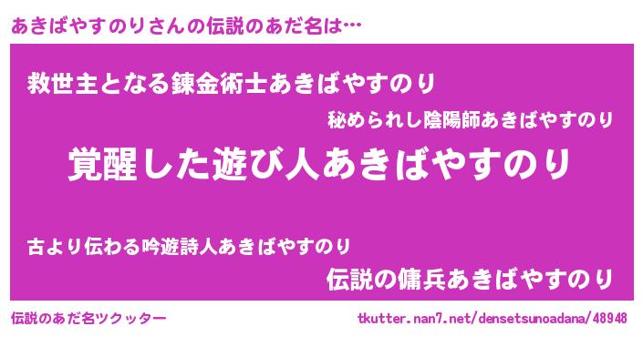 | 男性向けラノベタイトル風あだ名 | 『あきばやすのりの嫁は女の子じゃないと思った?』 |