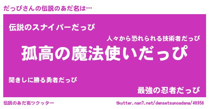 | 胡散臭い通販商品みたいなあだ名 | 『信頼と実績のサプリメント…その名も「だっぴ」』 |