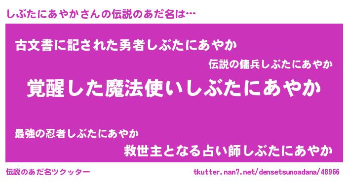 | 男性向けラノベタイトル風あだ名 | 『しぶたにあやかの嫁は女の子じゃないと思った?』 |