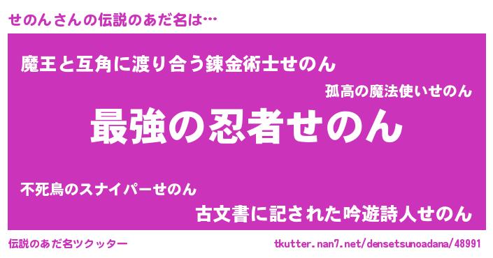 | ヒーロー風カッコイイあだ名 | 『究極戦士セノン』『ウルトラせのんマン』 |