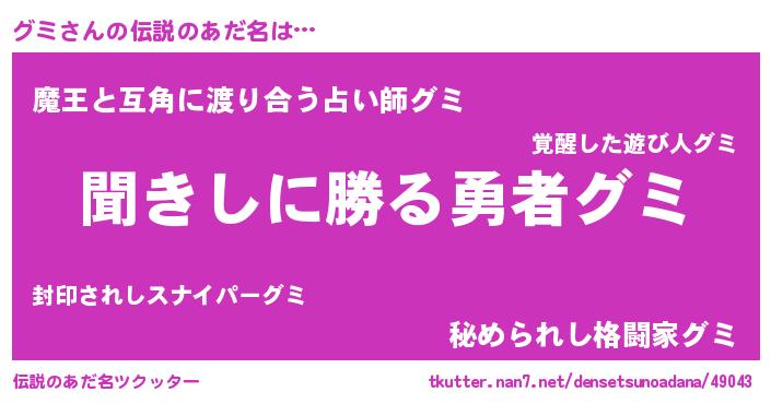 | ヒーロー風カッコイイあだ名 | 『超時空戦士グミ』『ネオグミ』 |