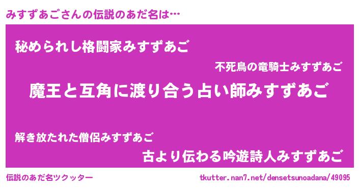 | 男性向けラノベタイトル風あだ名 | 『みすずあごに滅ぼされるだけの簡単なお仕事です』 |