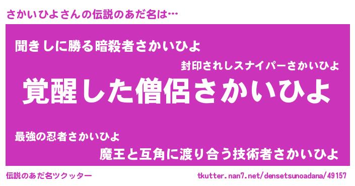 | 意味不明あだ名 | 『住所不定無職さかいひよ(56歳)』 |