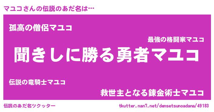 | 男性向けラノベタイトル風あだ名 | 『マユコという概念が存在しない退屈な世界 』 |