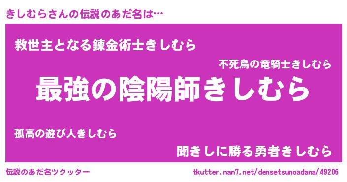 | 男性向けラノベタイトル風あだ名 | 『きしむら~年齢イコール彼女いない歴の魔法使い~』 |