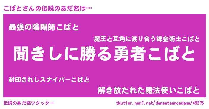 | 男性向けラノベタイトル風あだ名 | 『魔弾の王とこばと』 |