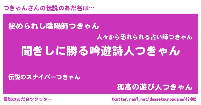 | 男性向けラノベタイトル風あだ名 | 『魔弾の王とつきゃん』 |