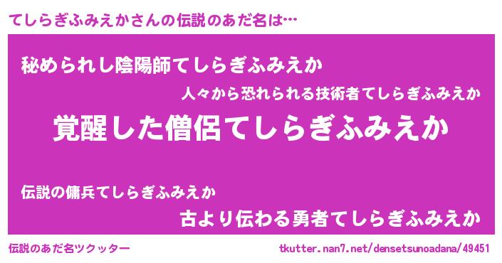 | 男性向けラノベタイトル風あだ名 | 『てしらぎふみえかの嫁は女の子じゃないと思った?』 |