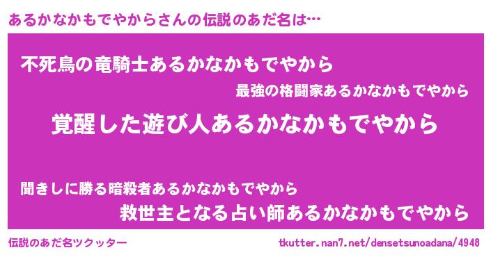 | 意味不明あだ名 | 『住所不定無職あるかなかもでやから(89歳)』 |
