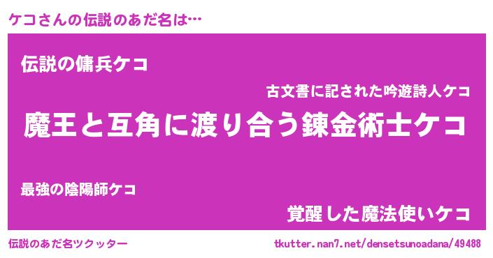 | 男性向けラノベタイトル風あだ名 | 『魔弾の王とケコ』『魔法科高校のケコ』 |