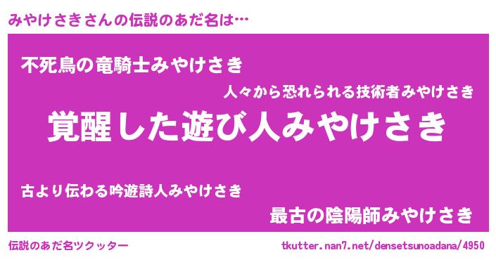 | ヒーロー風カッコイイあだ名 | 『天弓騎士ミヤ』『超時空戦士ミヤケサキ』 |