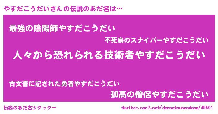| 男性向けラノベタイトル風あだ名 | 『おまえをオタクにしてやるから、俺をやすだこうだいにしてくれ! 』 |