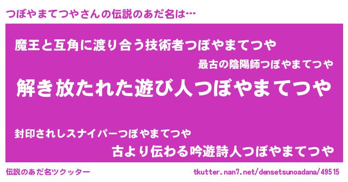 | ヒーロー風カッコイイあだ名 | 『幻影騎士ツボ』『ネオツボヤマテツヤ』 |