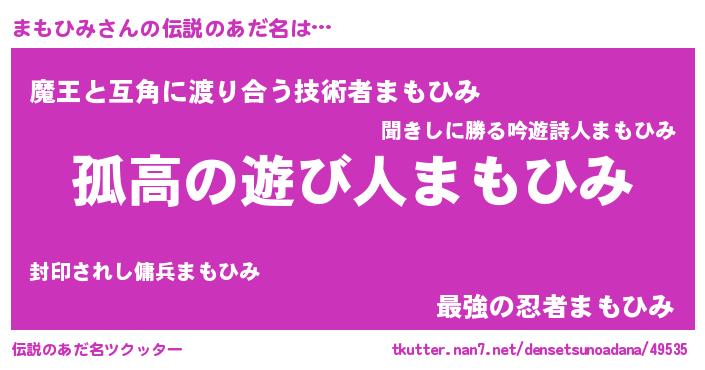 | 男性向けラノベタイトル風あだ名 | 『マモヒミスレイヤー』 |