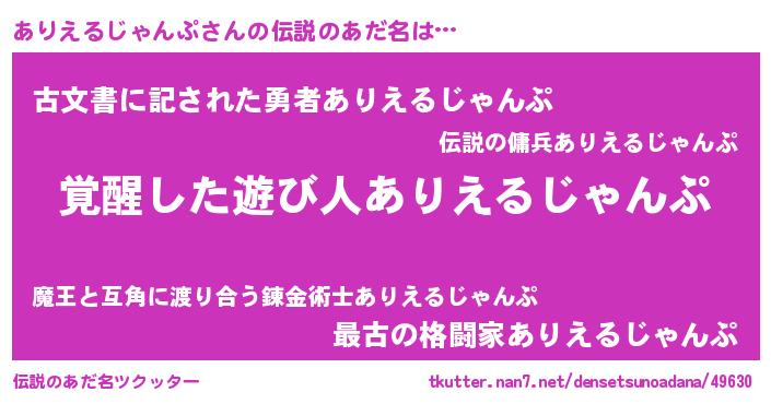 | 男性向けラノベタイトル風あだ名 | 『ありえるじゃんぷ~年齢イコール彼女いない歴の魔法使い~』 |