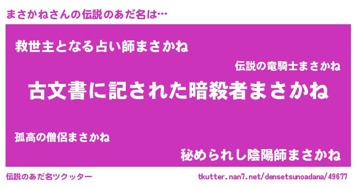 | ヒーロー風カッコイイあだ名 | 『ネオマサカネ』『正義の使者まさかね』 |