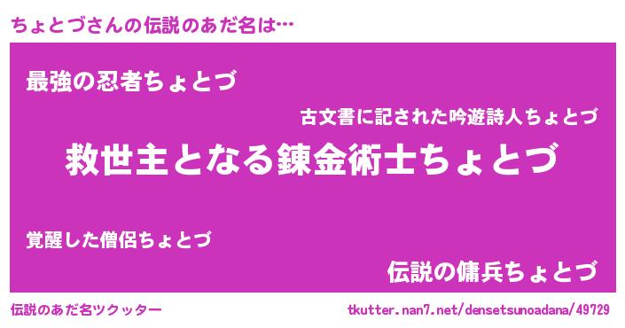 | 男性向けラノベタイトル風あだ名 | 『ちょとづ~年齢イコール彼女いない歴の魔法使い~』 |