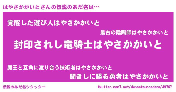 | 男性向けラノベタイトル風あだ名 | 『ハヤサカカイトアートオンライン』 |
