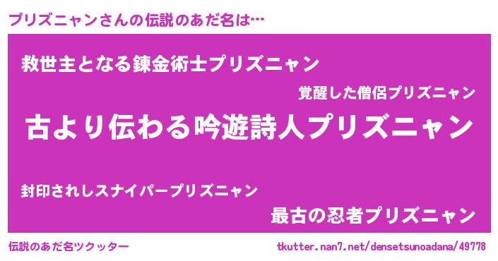 | 男性向けラノベタイトル風あだ名 | 『プリズニャンという概念が存在しない退屈な世界 』 |