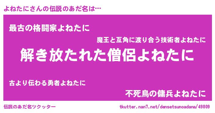 | 男性向けラノベタイトル風あだ名 | 『この素晴らしい世界によねたにを!』 |