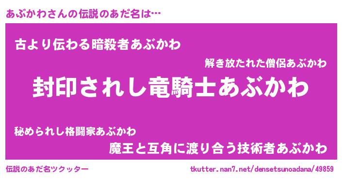 | 男性向けラノベタイトル風あだ名 | 『アブカワアートオンライン』 |
