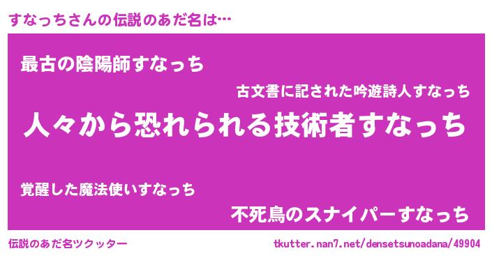 | 男性向けラノベタイトル風あだ名 | 『おまえをオタクにしてやるから、俺をすなっちにしてくれ! 』 |