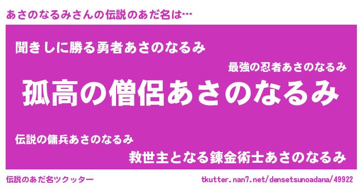 | ヒーロー風カッコイイあだ名 | 『黄金騎士アサ』『ネオアサノナルミ』 |