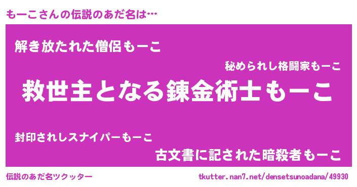 | 女子向けラノベタイトル風あだ名 | 『死神もーこの再婚』『もーこ様がみてる』 |