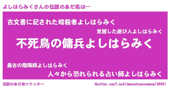 | ヒーロー風カッコイイあだ名 | 『スーパーヨシハラミク』『天弓騎士ヨシ』 |