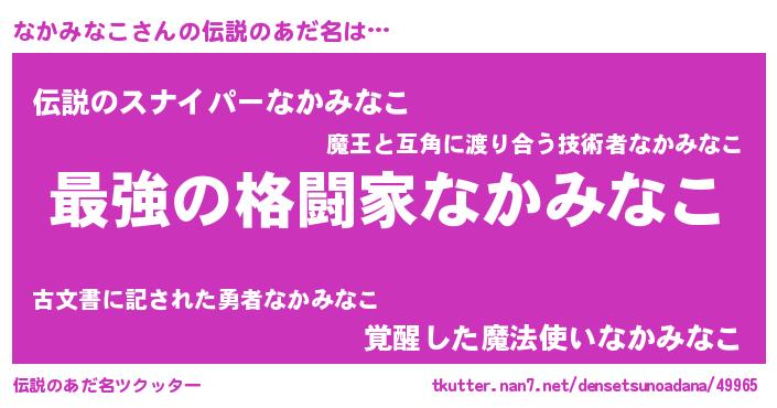 | ヒーロー風カッコイイあだ名 | 『仮面ナカダー』『最強戦士ナカミナコ』 |