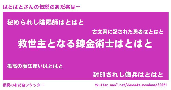 | 男性向けラノベタイトル風あだ名 | 『ノーゲーム・ノーハトハト』 |