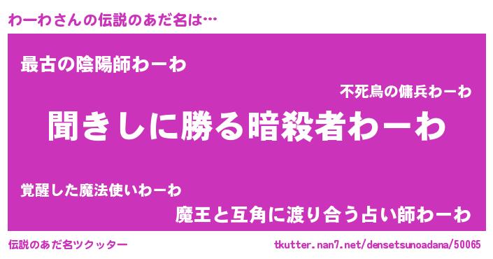 | 男性向けラノベタイトル風あだ名 | 『ワーワスレイヤー』『魔弾の王とわーわ』 |