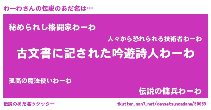 | ヒーロー風カッコイイあだ名 | 『ネオワーワ』『ウルトラわーわマン』 |