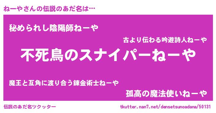 | ヒーロー風カッコイイあだ名 | 『スーパーネーヤ』『ウルトラねーやマン』 |