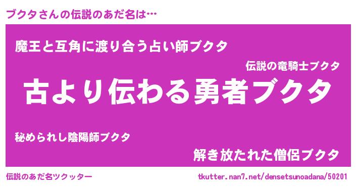 | ヒーロー風カッコイイあだ名 | 『ネオブクタ』『仮面ブクダー』 |