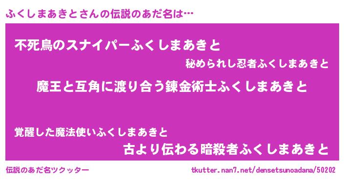 | 意味不明あだ名 | 『住所不定無職ふくしまあきと(74歳)』 |