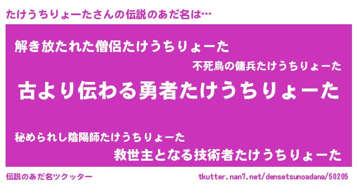 | ヒーロー風カッコイイあだ名 | 『ネオタケウチリョータ』『魔戒騎士タケ』 |